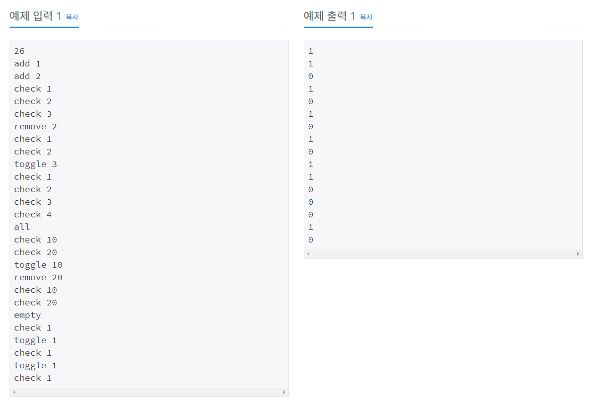 첫째 줄에 수행해야 하는 연산의 수 M (1 ≤ M ≤ 3,000,000)이 주어진다. 둘째 줄부터 M개의 줄에 수행해야 하는 연산이 한 줄에 하나씩 주어진다.