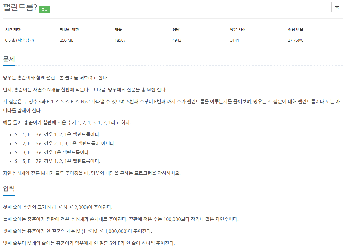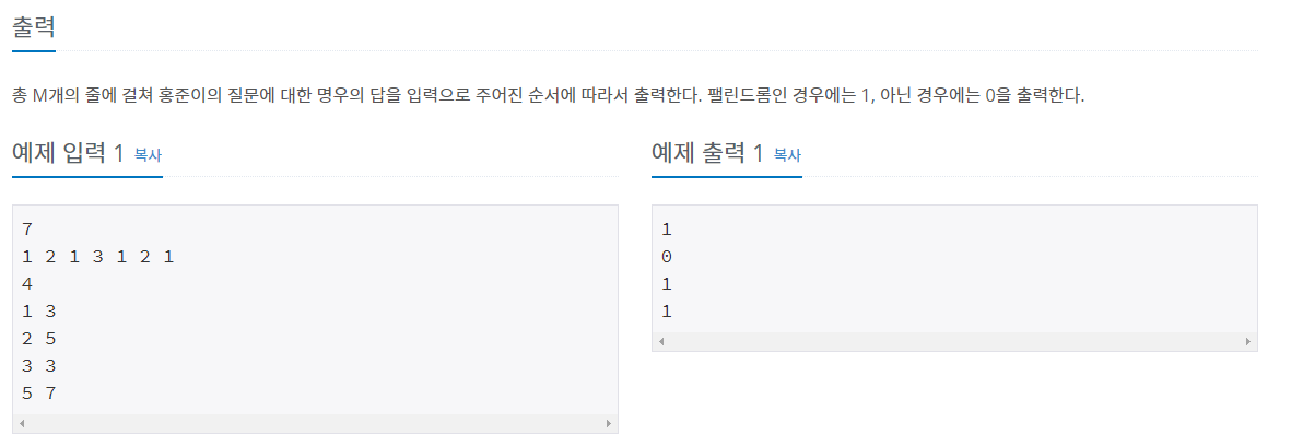 총 M개의 줄에 걸쳐 홍준이의 질문에 대한 명우의 답을 입력으로 주어진 순서에 따라서 출력한다. 팰린드롬인 경우에는 1, 아닌 경우에는 0을 출력한다.