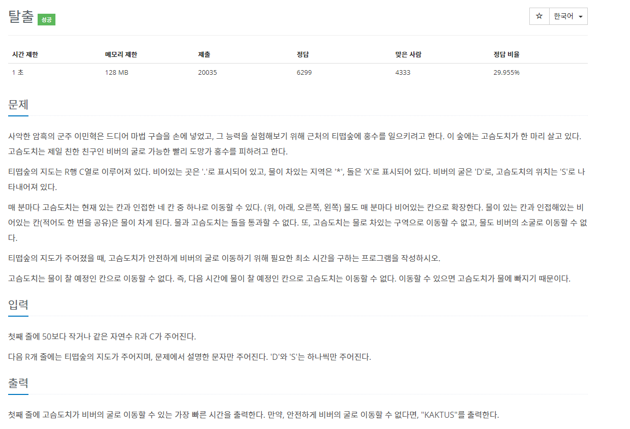 문제 사악한 암흑의 군주 이민혁은 드디어 마법 구슬을 손에 넣었고, 그 능력을 실험해보기 위해 근처의 티떱숲에 홍수를 일으키려고 한다. 이 숲에는 고슴도치가 한 마리 살고 있다. 고슴도치는 제일 친한 친구인 비버의 굴로 가능한 빨리 도망가 홍수를 피하려고 한다. 티떱숲의 지도는 R행 C열로 이루어져 있다. 비어있는 곳은 '.'로 표시되어 있고, 물이 차있는 지역은 '*', 돌은 'X'로 표시되어 있다. 비버의 굴은 'D'로, 고슴도치의 위치는 'S'로 나