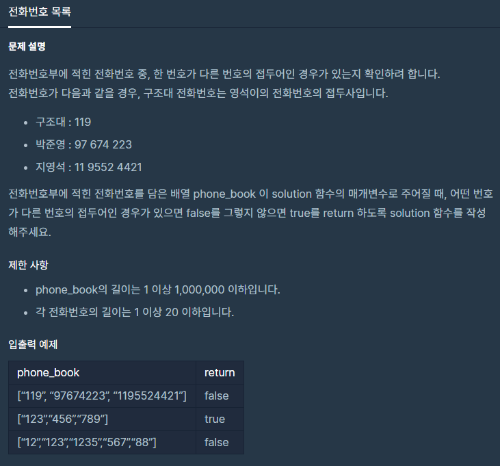 전화번호부에 적힌 전화번호 중, 한 번호가 다른 번호의 접두어인 경우가 있는지 확인하려 합니다. 전화번호가 다음과 같을 경우, 구조대 전화번호는 영석이의 전화번호의 접두사입니다. 구조��