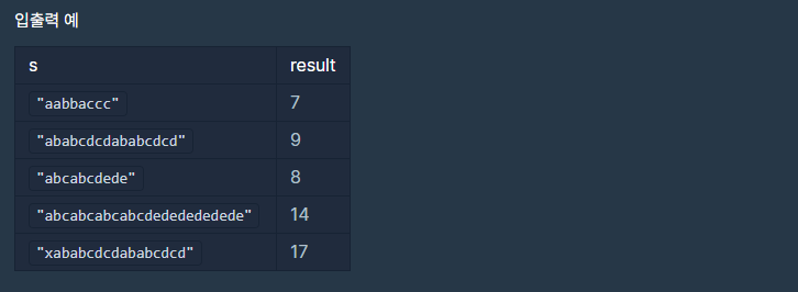 - 1자리 부터 시작하여 문자열 길이의 절반까지의 길이 만큼의 문자의 중복을 체크한다.