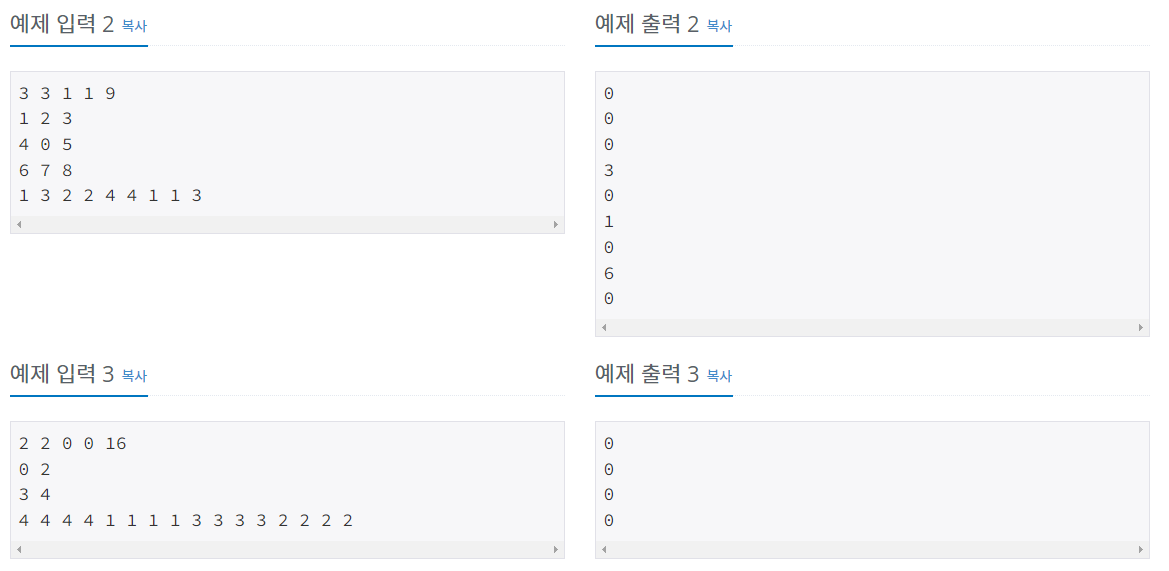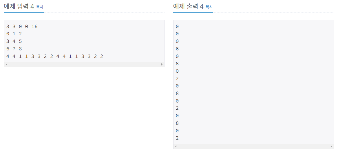 첫째 줄에 지도의 세로 크기 N, 가로 크기 M (1 ≤ N, M ≤ 20), 주사위를 놓은 곳의 좌표 x, y(0 ≤ x ≤ N-1, 0 ≤ y ≤ M-1), 그리고 명령의 개수 K (1 ≤ K ≤ 1,000)가 주어진다. 둘째 줄부터 N개의 줄에 지