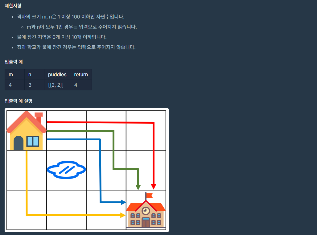 계속되는 폭우로 일부 지역이 물에 잠겼습니다. 물에 잠기지 않은 지역을 통해 학교를 가려고 합니다. 집에서 학교까지 가는 길은 m x n 크기의 격자모양으로 나타낼 수 있습니다. 아래 그림은 m =