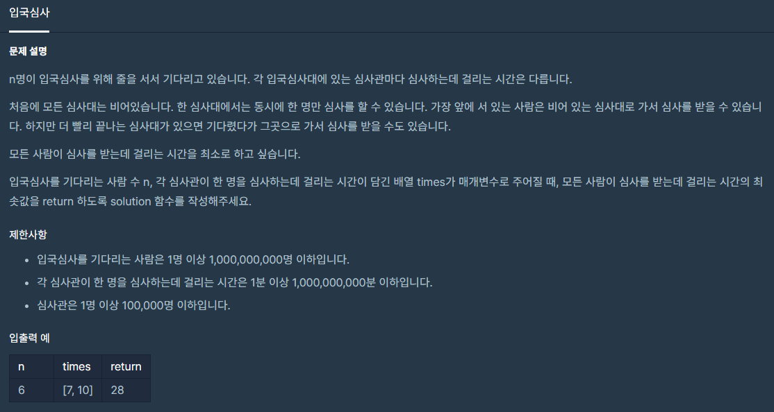 입국심사를 기다리는 사람의 최대수가 10억명인것을 보면 for문을 사용해도 시간초과가 날수있다는 것을 생각하고 다른 방식의 풀이를 생각해야합니다.