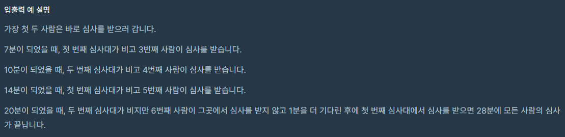 n명이 입국심사를 위해 줄을 서서 기다리고 있습니다. 각 입국심사대에 있는 심사관마다 심사하는데 걸리는 시간은 다릅니다. 처음에 모든 심사대는 비어있습니다. 한 심사대에서는 동시에 한