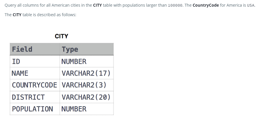 CTIY 테이블에서 인구가 100,000을 초과하는 모든 칼럼을 출력하는 문제입니다.