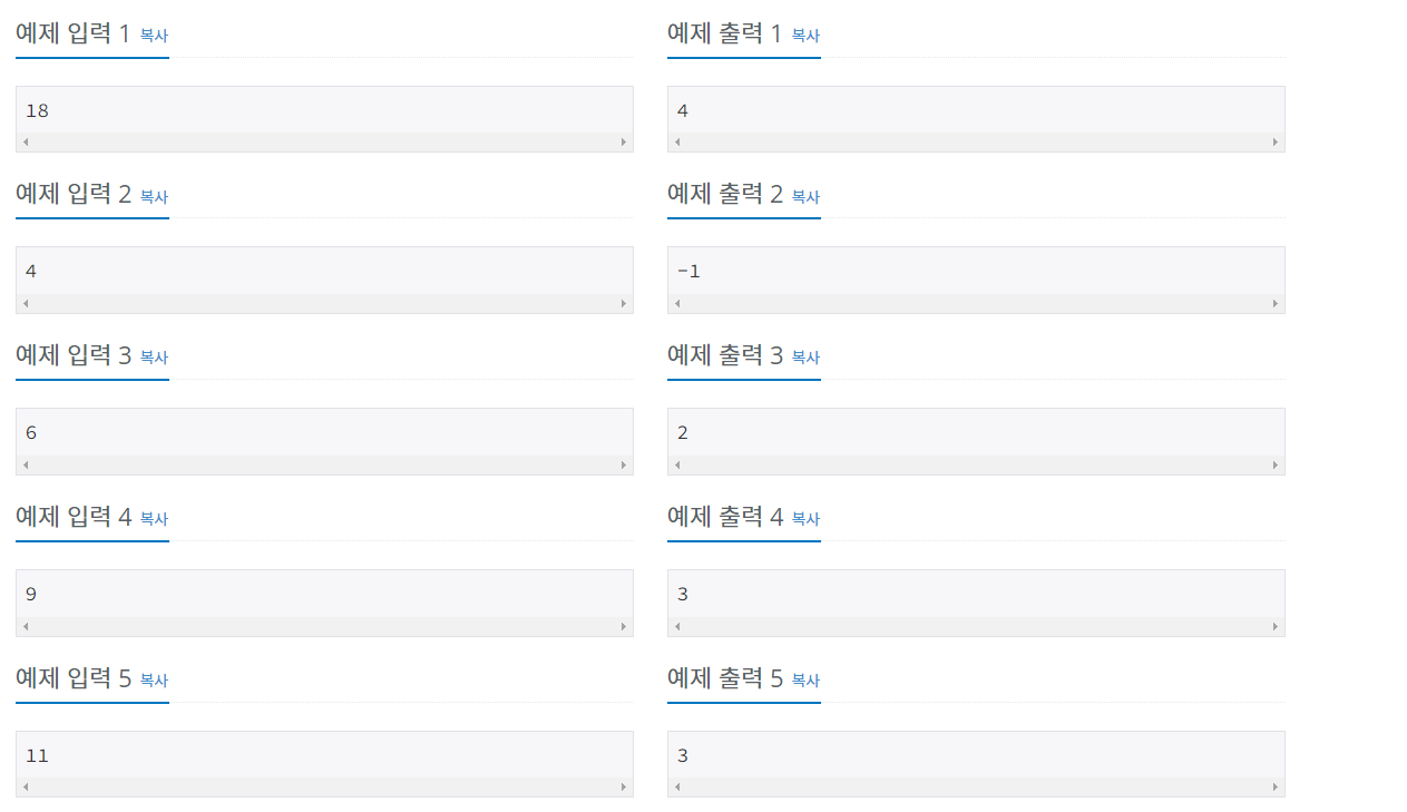 - n값이 5로 나누었을 때 나머지가 존재한다면 n 값은 3만큼 빼고 봉지의 갯수를 1개 늘립니다.