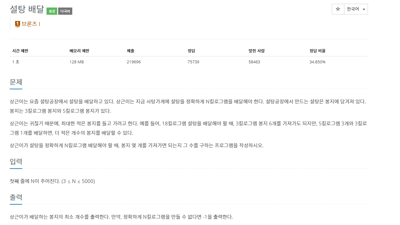 상근이는 요즘 설탕공장에서 설탕을 배달하고 있다. 상근이는 지금 사탕가게에 설탕을 정확하게 N킬로그램을 배달해야 한다. 설탕공장에서 만드는 설탕은 봉지에 담겨져 있다. 봉지는 3킬로그
