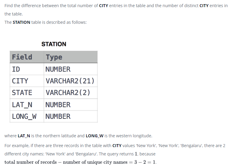 STATION 테이블에서 전체 CITY 수 - 중복되지 않는 CITY수를 구하는 문제입니다.