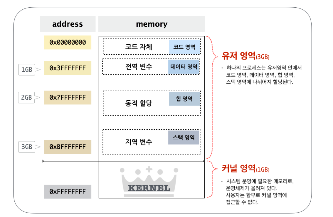메모리 영역은 유저 영역과 커널 영역 두가지의 영역으로 나뉘어집니다.