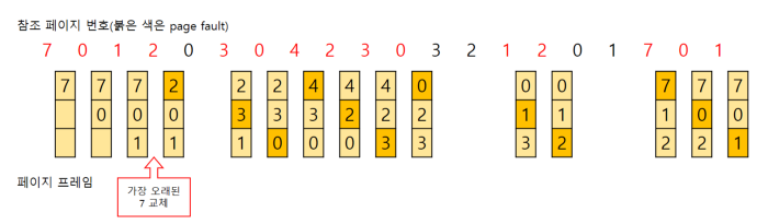 - 가장 간단한 알고리즘으로, 메모리에 올라온 지 가장 오래된 페이지를 교체합니다. 간단하고, 초기화 코드에 대해 적절한 방법이며, 페이지가 올라온 순서를 큐에 저장합니다.