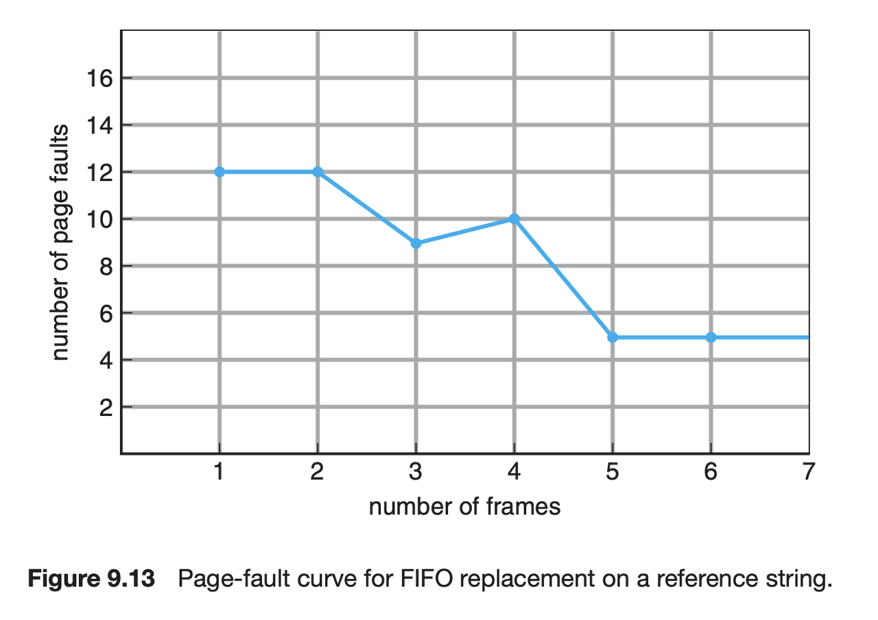 프레임 수가 증가하면(= 메모리 용량이 증가하면) page fault 수가 줄어드는 것이 정상적이다.
