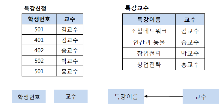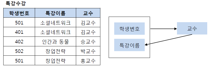 특강수강 테이블에서 기본키는 (학생번호, 특강이름)이다. 그리고 기본키 (학생번호, 특강이름)는 교수를 결정하고 있다. 또한 여기서 교수는 특강이름을 결정하고 있다.