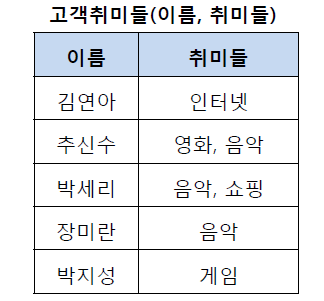 위와 같은 테이블을 보자. 101번 학생은 자바와 C++ 과목을 수강하고, 노래와 게임을 취미로 가진다.