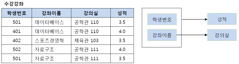 이 테이블에서 기본키는 (학생번호, 강좌이름)으로 복합키이다. 그리고 (학생번호, 강좌이름)인 기본키는 성적을 결정하고 있다. (학생번호, 강좌이름) --> (성적)