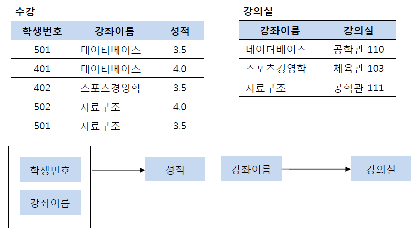 그런데 여기서 강의실이라는 컬럼은 기본키의 부분집합인 강좌이름에 의해 결정될 수 있다. (강좌이름) --> (강의실)