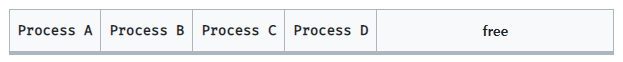 외부 단편화를 해소하기 위해 프로세스가 사용하는 공간들을 한쪽으로 몰아 자유공간을 확보하는 방법론. 작업 효율이 좋진 않다. 위의 메모리 현황을 압축 작업을 하게 된다면 아래와 같이 바뀐다.