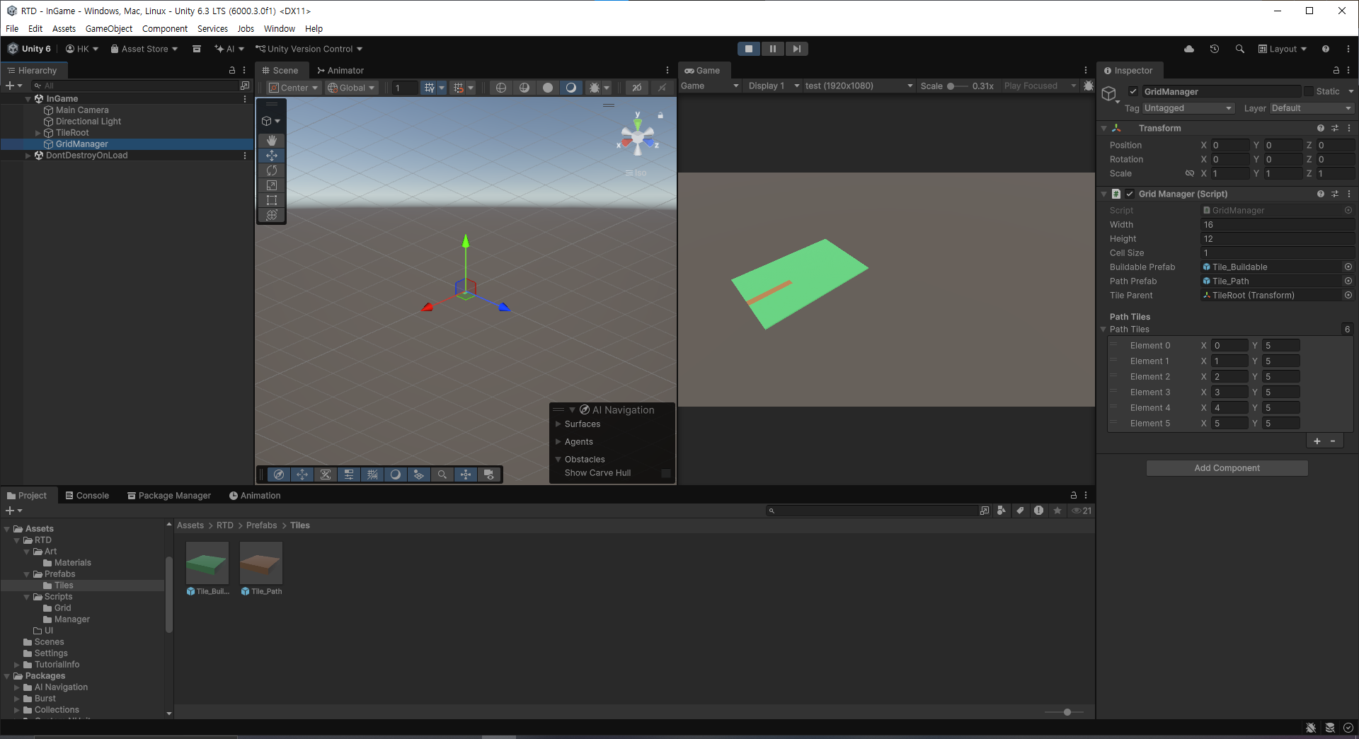 간단한 매니저 기본 설계 후 생성한 타일 프리팹을 적용하여 실제로 원하는 형태의 길과 맵이 생성되는지를 확인