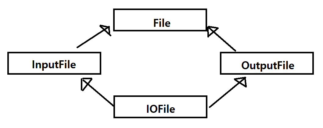 기본 클래스로부터 사본을 하나씩 물려받게 되니까 결과적으로 fileName 데이터 멤버가 두 개이어야 할 것도 같고, 단순하게 봤을때 IOFile 객체는 파일 이름이 하나만 있는 게 맞으니까, 두 기본 클래스로부터 fileName을 동시에 물려받더라도 fileName이 중복되면 안 될 것도 같습니다.