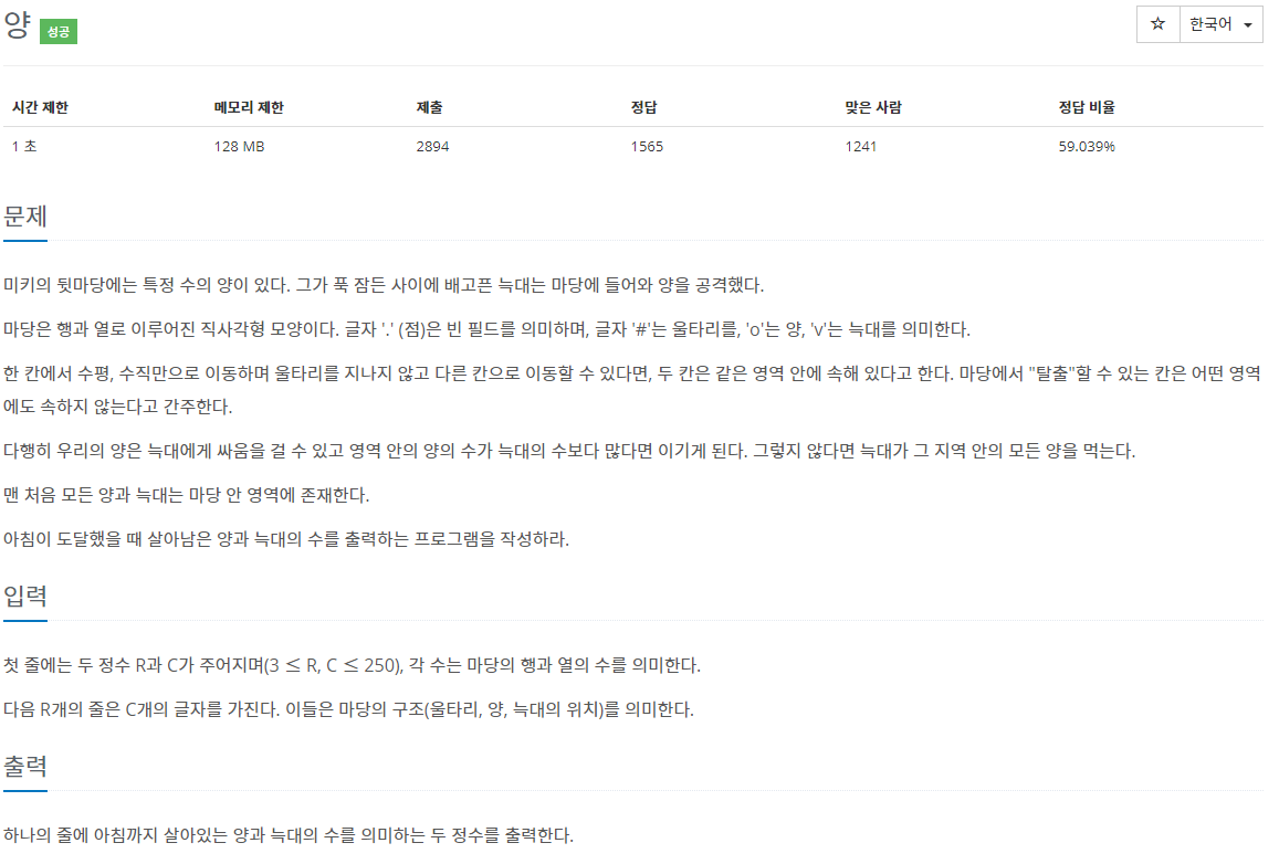 문제 미키의 뒷마당에는 특정 수의 양이 있다. 그가 푹 잠든 사이에 배고픈 늑대는 마당에 들어와 양을 공격했다. 마당은 행과 열로 이루어진 직사각형 모양이다. 글자 '.' (점)은 빈 필드를 의미하며, 글자 '#'는 울타리를, 'o'는 양, 'v'는 늑대를 의미한다. 한 칸에서 수평, 수직만으로 이동하며 울타리를 지나지 않고 다른 칸으로 이동할 수 있다면, 두 칸은 같은 영역 안에 속해 있다고 한다. 마당에서 "탈출"할 수 있는 칸은 어떤 영역에도 속하지