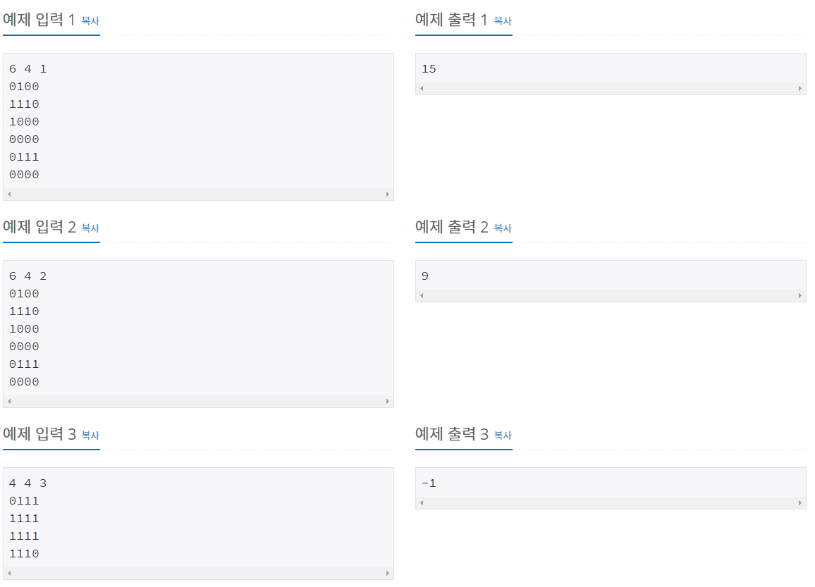 첫째 줄에 N(1 ≤ N ≤ 1,000), M(1 ≤ M ≤ 1,000), K(1 ≤ K ≤ 10)이 주어진다. 다음 N개의 줄에 M개의 숫자로 맵이 주어진다. (1, 1)과 (N, M)은 항상 0이라고 가정하자.