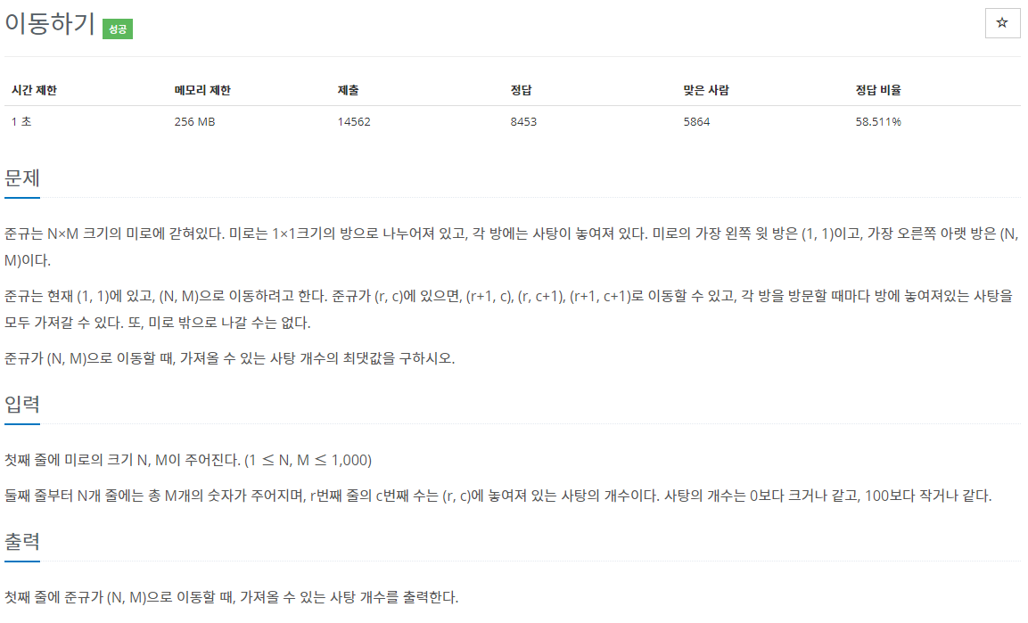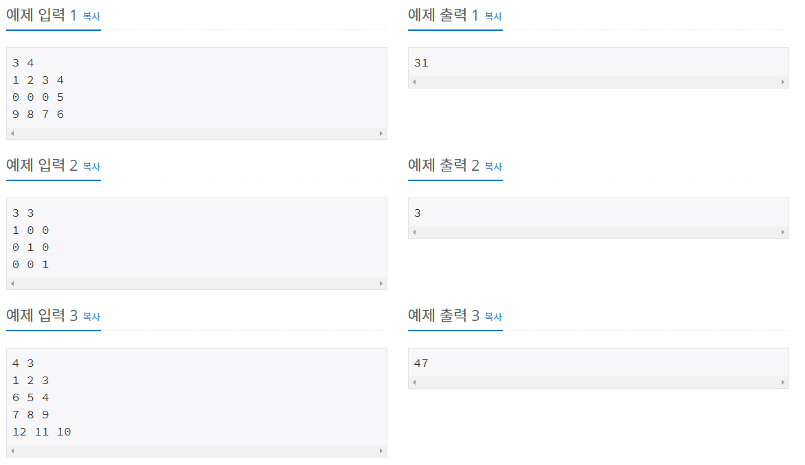 준규는 N×M 크기의 미로에 갇혀있다. 미로는 1×1크기의 방으로 나누어져 있고, 각 방에는 사탕이 놓여져 있다. 미로의 가장 왼쪽 윗 방은 (1, 1)이고, 가장 오른쪽 아랫 방은 (N, M)이다. 준규는 현재 (1, 1)에 있고, (N, M)으로 이동하려고 한다. 준규가 (r, c)에 있으면, (r+1, c), (r, c+1), (r+1, c+1)로 이동할 수 있고, 각 방을 방문할 때마다 방에 놓여져있는 사탕을 모두 가져갈 수 있다. 또, 미로 밖으