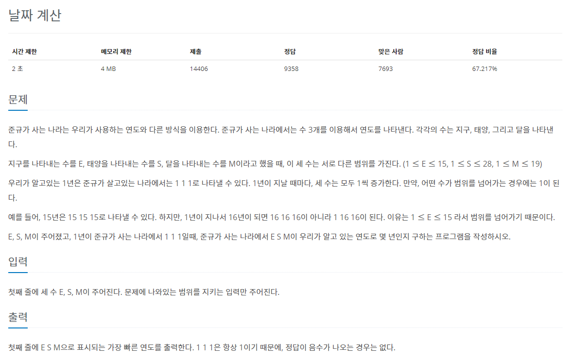 - E, S, M을 증가시키면서 해당 범위에 도달하면 그 다음 차례에 1값으로 초기화 시키는 방식으로 진행합니다.