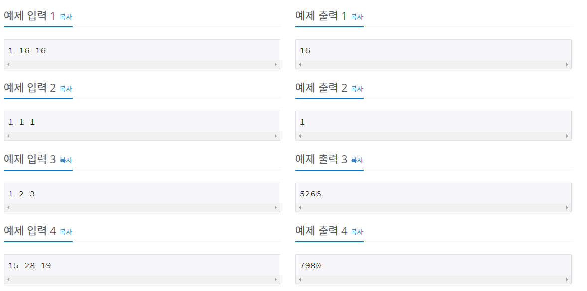 int e, s, m, a = 1, b = 1, c = 1, count = 0;