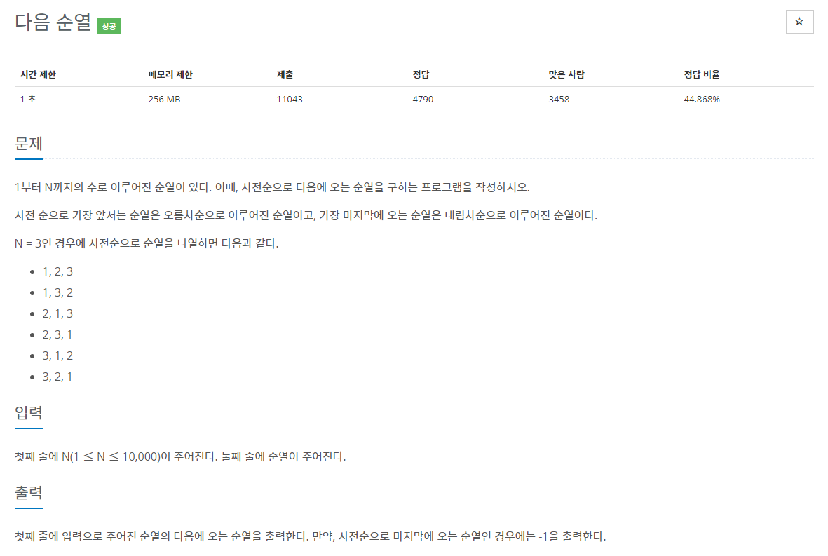 - 주어진 순열의 다음 순열을 구하는 문제이다.