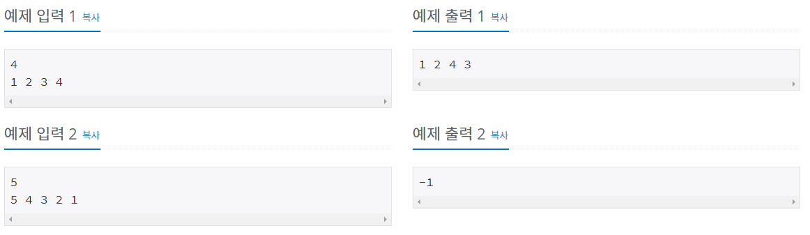 첫째 줄에 입력으로 주어진 순열의 다음에 오는 순열을 출력한다. 만약, 사전순으로 마지막에 오는 순열인 경우에는 -1을 출력한다.